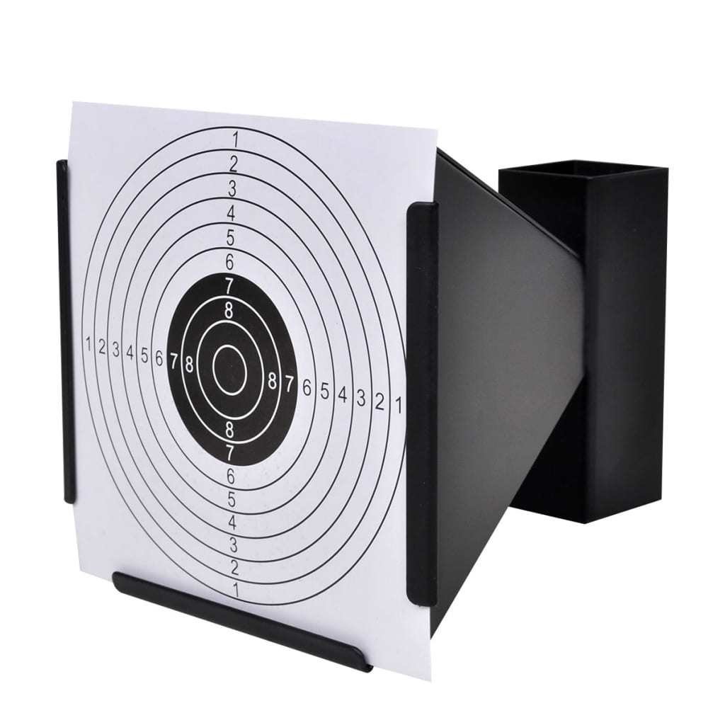 This pellet trap holds 5.5" paper targets and its funnel design helps to reduce rebounds. Our target holder catches pellets automatically, which makes it easier to clean up.