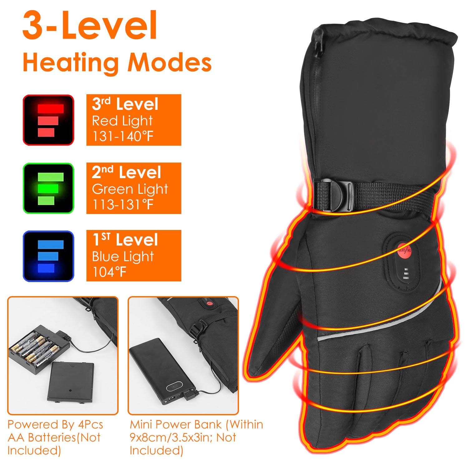 *Super Warm & 3 Heating Modes*:Our heated gloves for men and women are made of high quality cloth material; which are more durable and breathable; including heating layers on the back and 4 finger parts and warm cotton layer; pretty warm and comfortable to use. Equipped with 3 heating modes from 104-140℉ for you to choose and warm your hands according to your personal needs.