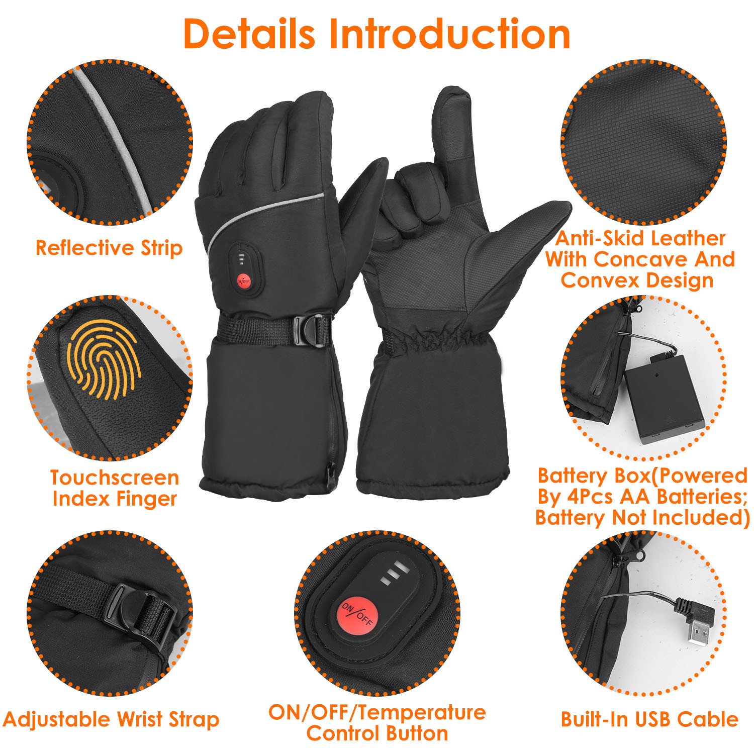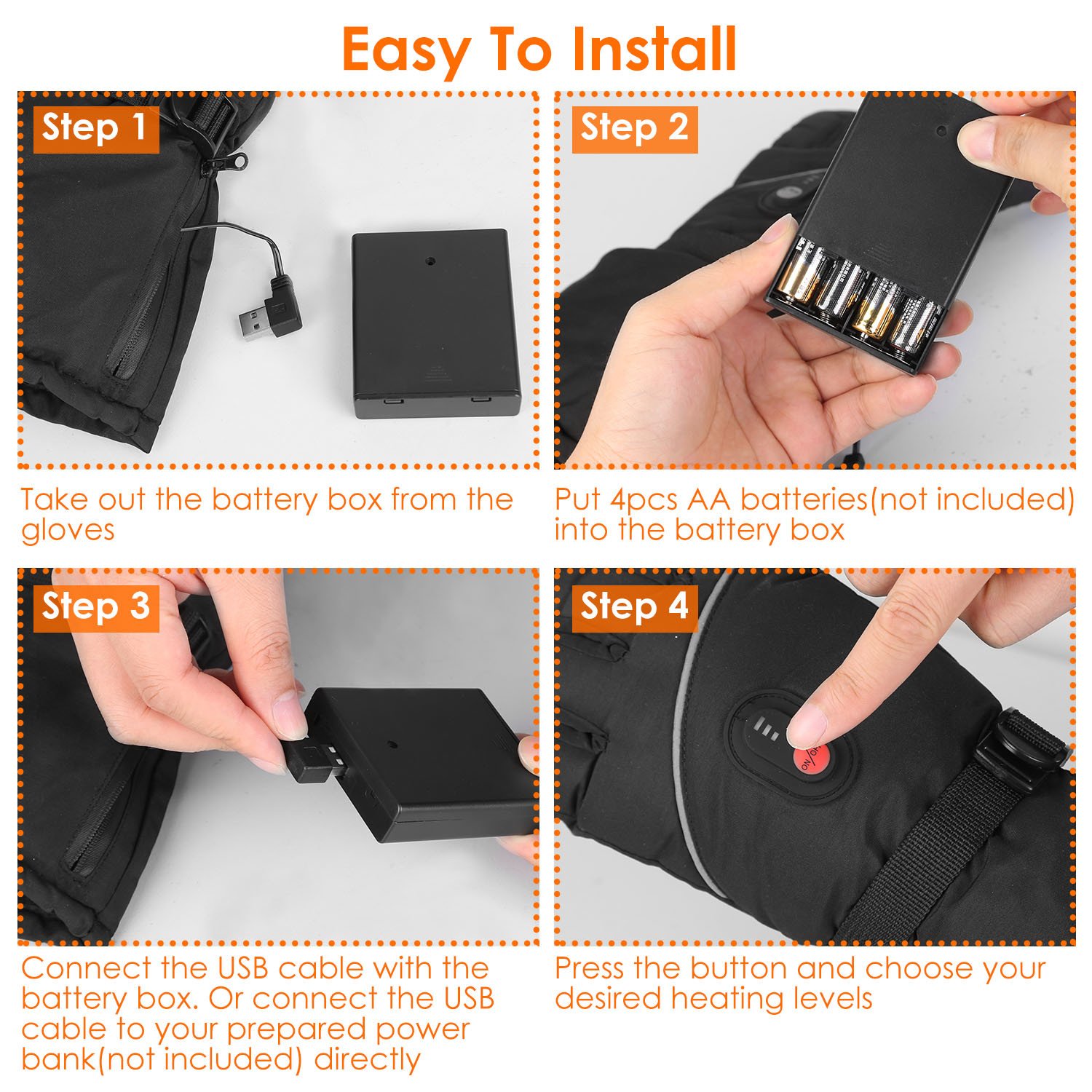*Independent Battery Box*:Battery heated gloves equip with 2 independent battery boxes; which is powered by 4*AA batteries(not included). Or you can also use your portable power bank(not included) to provide power for your heated gloves.