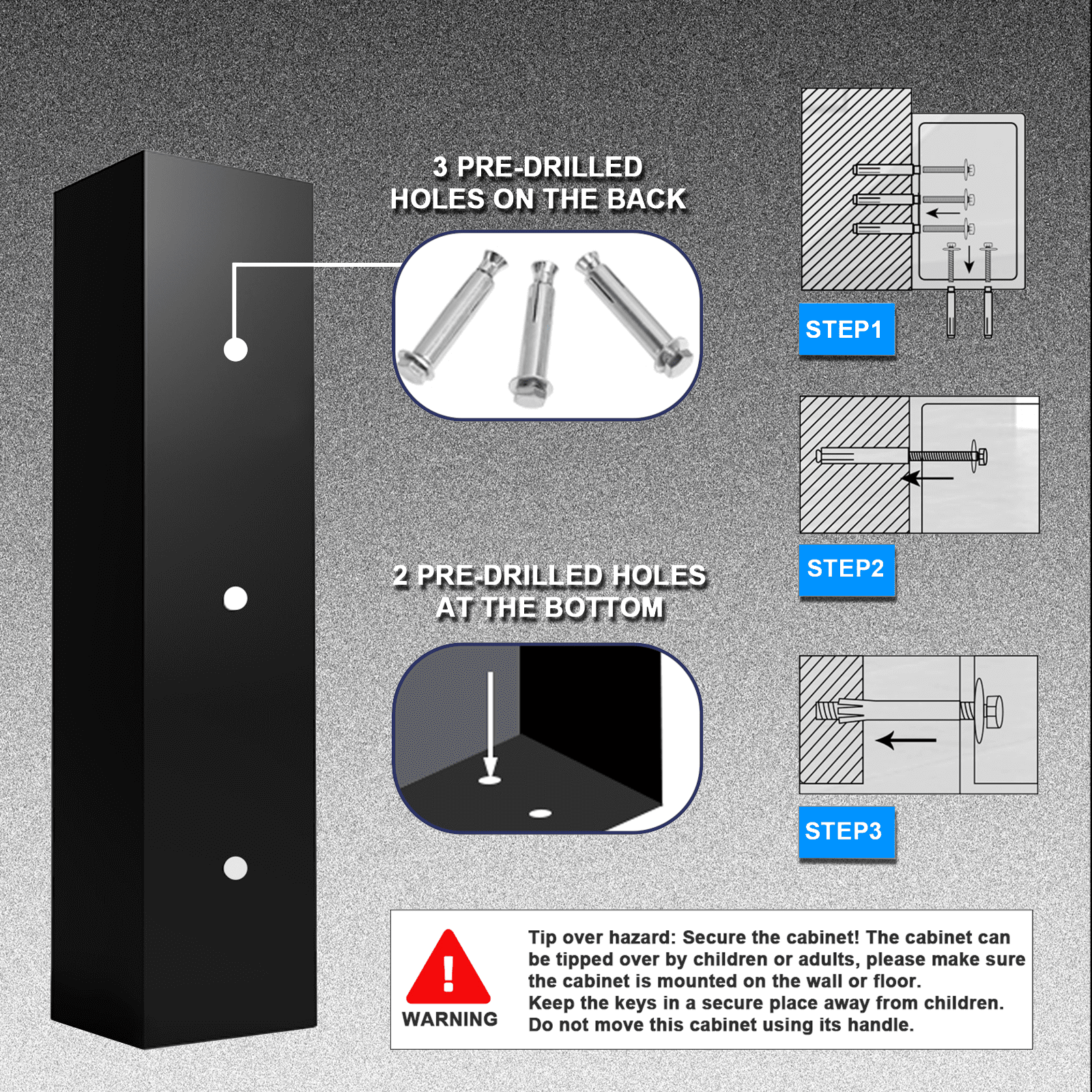 The gun cabinet comes with pre-punched holes in the back and at the bottom for easy attachment and necessary hardware for wall or floor mounting.You are free to fix it anywhere you want with the supplied ground bolts
