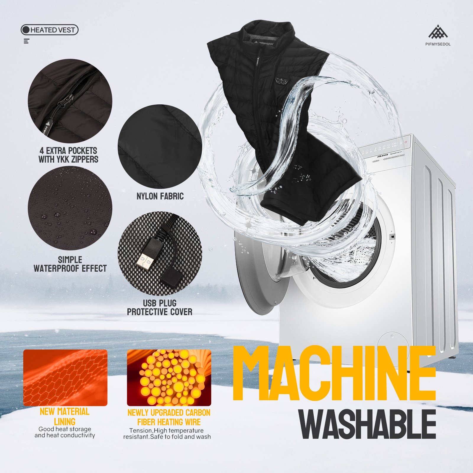 4.Machine Washable with Laundry Bag. Its internal carbon fiber heating wire is highly resistant to folding, making it machine washable and hand washable. Remove the battery before washing and cover the USB port's protective cover. Place the heated vest in a laundry bag for increased durability.