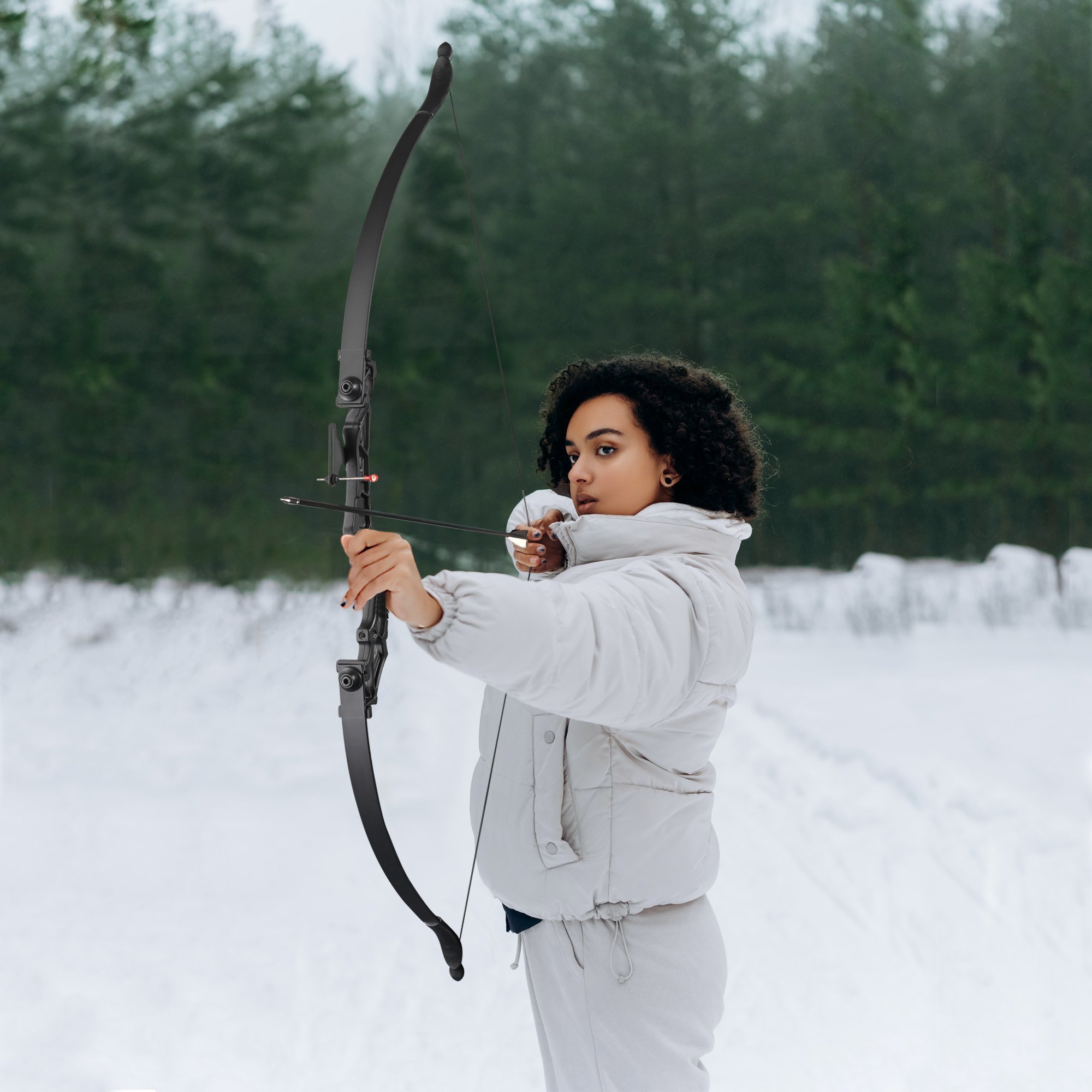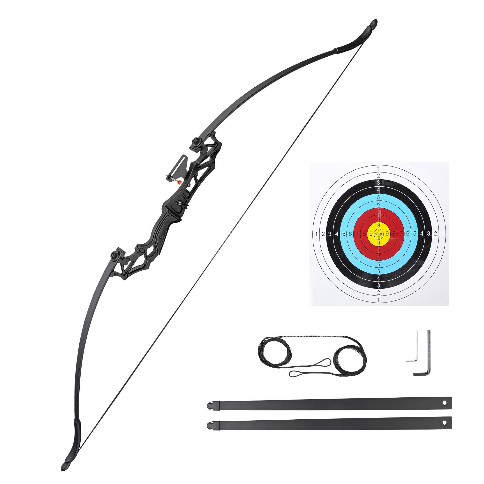 - Takedown Recurve Bow - Includes a recurve bow; spare straight limbs; spare bow string and target paper; designed for right hand shooters; beginners or skilled archers to practice archery skills; which is also perfect for outdoor hunting; horse riding; bowfishing; target archery & more