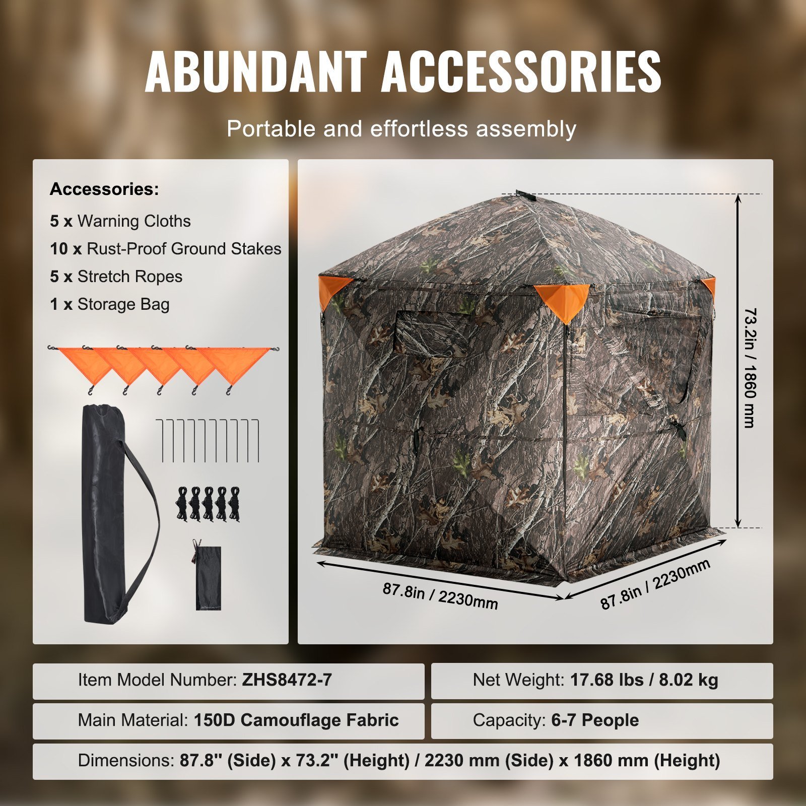 4.Spacious Interior: The pop up ground blind measures 87.8 (side) x 73.2 inches (height), comfortably accommodating 6-7 people. It has side zipper-up flip doors that can open fully, providing unobstructed access, which is convenient for people with limited mobility.