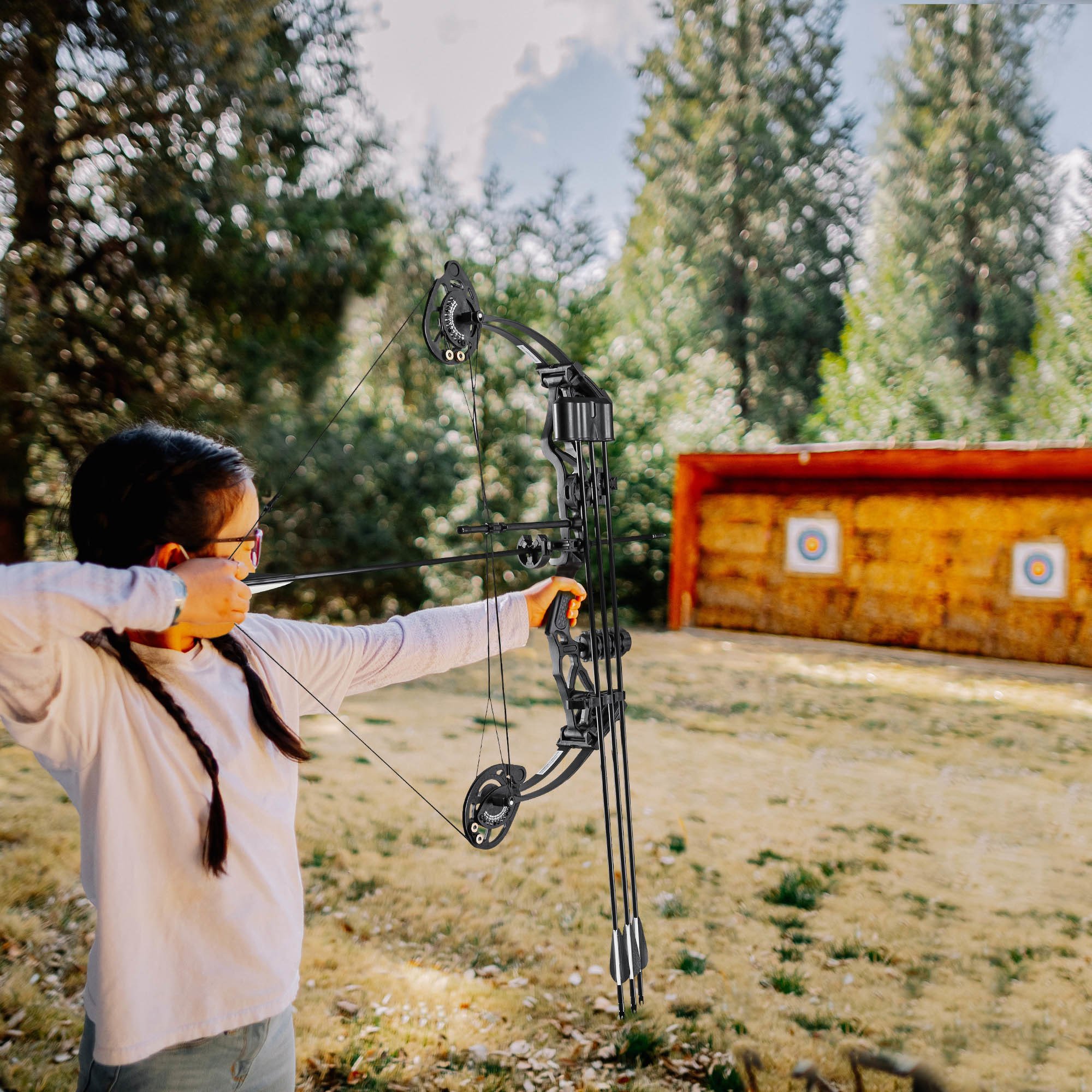- Youth Compound Bow Set - Includes a 16 to 28 Lbs right hand compound bow; target paper & 6 carbon arrows; Weights only 2.5 Lbs for easy grasping; a perfect gift for teenagers; young archers or beginners to learn & practice shooting; outdoor hunting; target archery & more