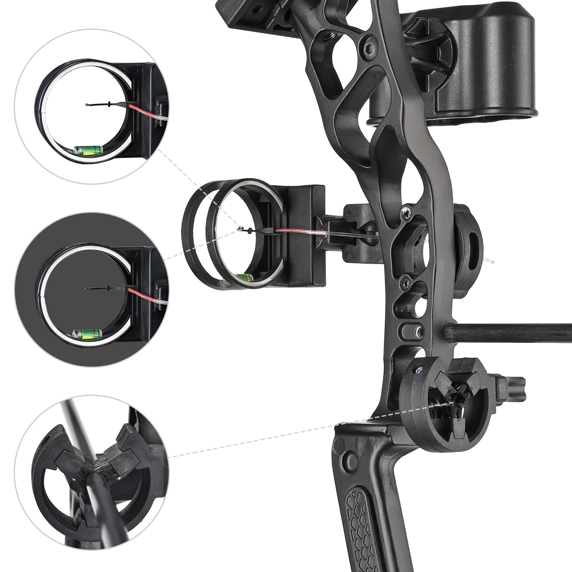 - Higher Aiming Accuracy - Sight installed for precise aiming; help you react quickly to a moving target; fiber optics reflect ambient light making it easy to see in low light; bubble level for leveling accuracy; Brush capture arrow rest offers clear view to the entire arrow & tip and reduces friction